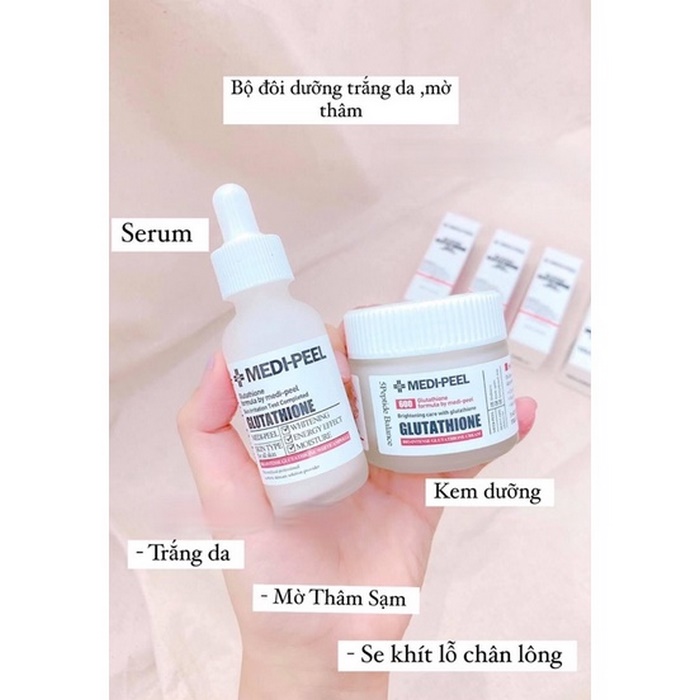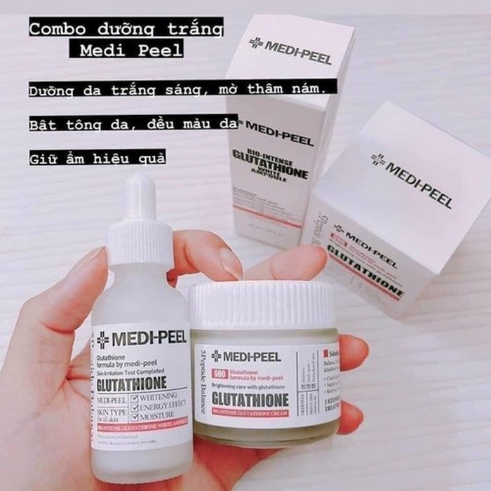 Medi-Peel Bio Intense Glutathione White Ampoule là sản phẩm dưỡng trắng da nổi tiếng đến từ Hàn Quốc, kết hợp giữa tinh chất và kem dưỡng với dung tích lần lượt là 30ml và 50g. Được biết đến với khả năng dưỡng trắng vượt trội, sản phẩm này chứa Glutathione, một chất chống oxy hóa mạnh mẽ giúp làm mờ các vết thâm nám và đều màu da một cách hiệu quả.Một trong những công dụng chính của Medi-Peel Glutathione Ampoule là khả năng cải thiện độ sáng của làn da. Tinh chất dưỡng trắng Medi-Peel không chỉ làm sáng da mà còn giúp phục hồi làn da bị tổn thương do tác động của môi trường. Thêm vào đó, sản phẩm này còn tăng cường độ ẩm cho da, giúp da luôn mềm mại và mịn màng.Medi-Peel Ampoule đặc biệt phù hợp cho những ai đang tìm kiếm giải pháp làm trắng da an toàn và hiệu quả. Sản phẩm dưỡng trắng Medi-Peel này còn giúp làm giảm nếp nhăn và ngăn ngừa dấu hiệu lão hóa, mang lại làn da trẻ trung và tươi tắn hơn.Đối tượng sử dụng chính của Medi-Peel Ampoule bao gồm những người có làn da không đều màu, làn da thiếu sức sống và những ai mong muốn cải thiện độ đàn hồi của da. Với công dụng Medi-Peel Ampoule nổi bật, sản phẩm này đã trở thành lựa chọn hàng đầu của nhiều người. Tuy nhiên, khi sử dụng, bạn cũng nên tìm hiểu kỹ Medi-Peel Ampoule mua ở đâu và Medi-Peel Ampoule giá bao nhiêu để đảm bảo mua được sản phẩm chính hãng với giá hợp lý.