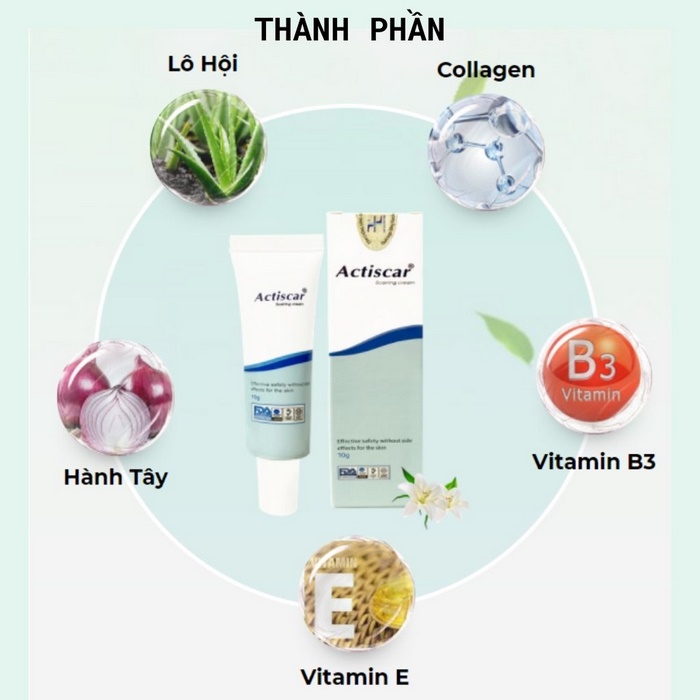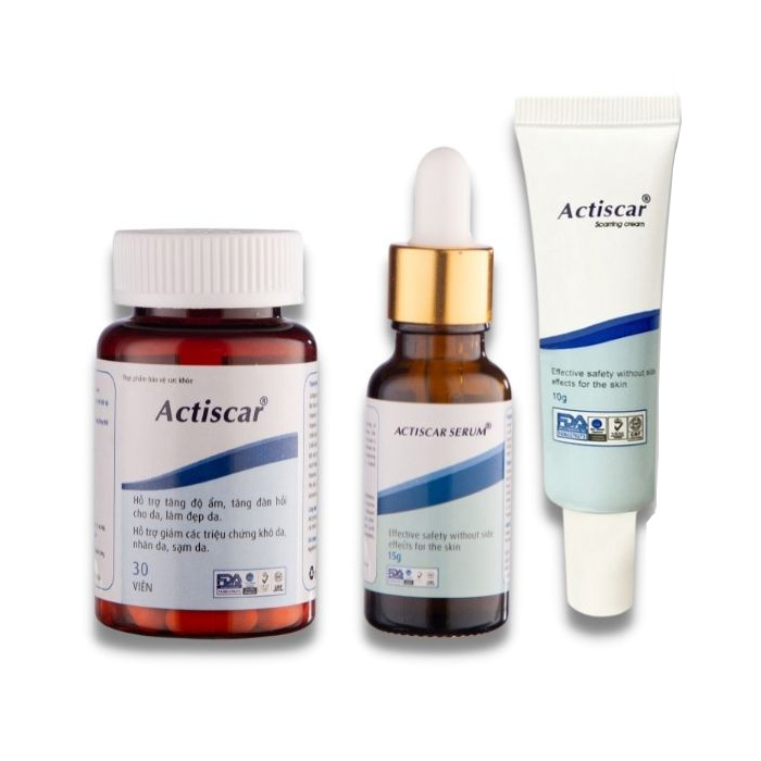 Bộ sản phẩm gồm kem Actiscar 20g, serum Actiscar 15g và viên uống 30 viên.