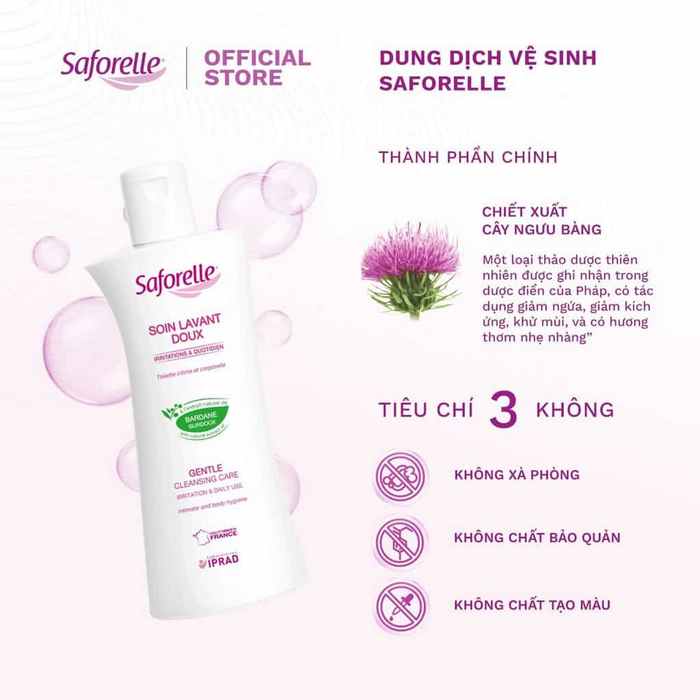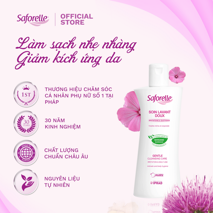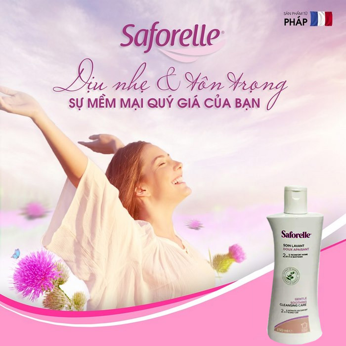 Dung dịch vệ sinh phụ nữ Saforelle là sản phẩm được hàng triệu phụ nữ trên thế giới tin dùng, nhờ công thức dịu nhẹ và an toàn. Sản phẩm được phát triển bởi các chuyên gia hàng đầu và đã qua kiểm nghiệm da liễu, đảm bảo không gây kích ứng, phù hợp với cả làn da nhạy cảm nhất.
