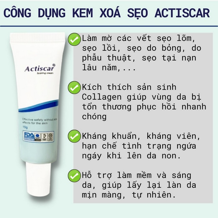 | Tên sản phẩm | Kem Actiscar 20g Actiscar – Hỗ trợ chăm sóc & làm mờ dấu vết sẹo trên da – Tuýp 20g – Việt Nam |