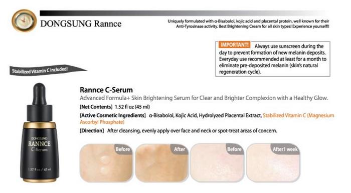 | Tên sản phẩm | Serum Dongsung Rannce C hỗ trợ giảm nám 45ml Hàn Quốc |