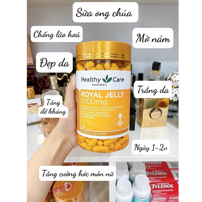 Sữa Ong Chúa Healthy Care Úc 365 viên/hộp là sản phẩm chăm sóc sức khỏe cao cấp, được sản xuất bởi thương hiệu nổi tiếng Healthy Care. Với hàm lượng 1000mg sữa ong chúa trong mỗi viên, sản phẩm này mang lại nhiều lợi ích đáng kể cho sức khỏe. Sữa ong chúa Healthy Care Royal Jelly 1000mg giàu vitamin và khoáng chất, giúp cải thiện sức khỏe tổng thể bằng cách tăng cường hệ miễn dịch, thúc đẩy quá trình trao đổi chất và hỗ trợ sức khỏe tim mạch. Ngoài ra, sản phẩm còn có tác dụng đáng kể trong việc cải thiện làn da, giúp da trở nên mịn màng và tươi trẻ hơn nhờ chứa các axit amin và hợp chất chống oxy hóa. Sự hỗ trợ này đặc biệt hữu ích cho những người thường xuyên tiếp xúc với môi trường ô nhiễm hoặc căng thẳng. Không chỉ vậy, sữa ong chúa còn giúp nâng cao sức khỏe sinh sản và cân bằng nội tiết tố, là lựa chọn tuyệt vời cho phụ nữ trong giai đoạn tiền mãn kinh.Sữa Ong Chúa Healthy Care 1000mg giá tốt và phù hợp với nhiều đối tượng, đặc biệt là người trưởng thành muốn cải thiện sức khỏe tổng thể, người có nhu cầu chăm sóc da từ bên trong và phụ nữ cần hỗ trợ sức khỏe sinh sản. Với giá sữa ong chúa Úc hợp lý, sản phẩm này là lựa chọn lý tưởng cho ai muốn chăm sóc sức khỏe một cách tự nhiên. Khi mua sữa ong chúa chính hãng, bạn hoàn toàn yên tâm về chất lượng và hiệu quả mà sản phẩm mang lại. Vậy sữa ong chúa Úc mua ở đâu để đảm bảo chính hãng? Bạn có thể tìm mua sữa ong chúa Úc chính hãng tại các cửa hàng uy tín hoặc trên những trang thương mại điện tử có kiểm định chất lượng.