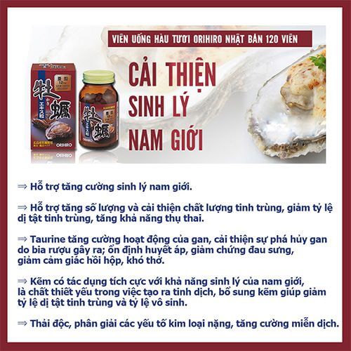 | Tên sản phẩm | Tinh Chất Hàu Tươi Orihiro Orihiro – Hỗ trợ sinh lực nam giới – Chai 120 viên – Nhật Bản |
