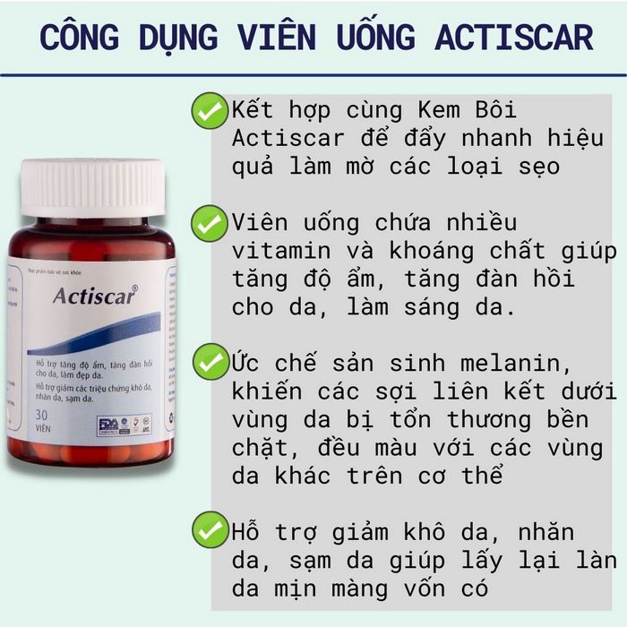 actiscar viên uống trị sẹo là sản phẩm hỗ trợ chăm sóc da được sản xuất tại Việt Nam. Sản phẩm actiscar 30 viên được nhiều người lựa chọn khi có nhu cầu hỗ trợ chăm sóc làn da sau khi xuất hiện sẹo hoặc tổn thương trên bề mặt da.