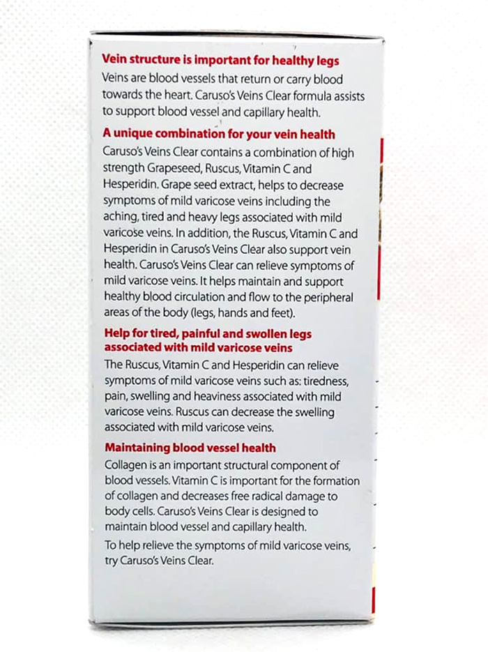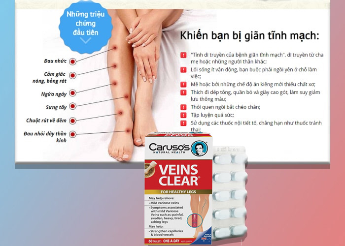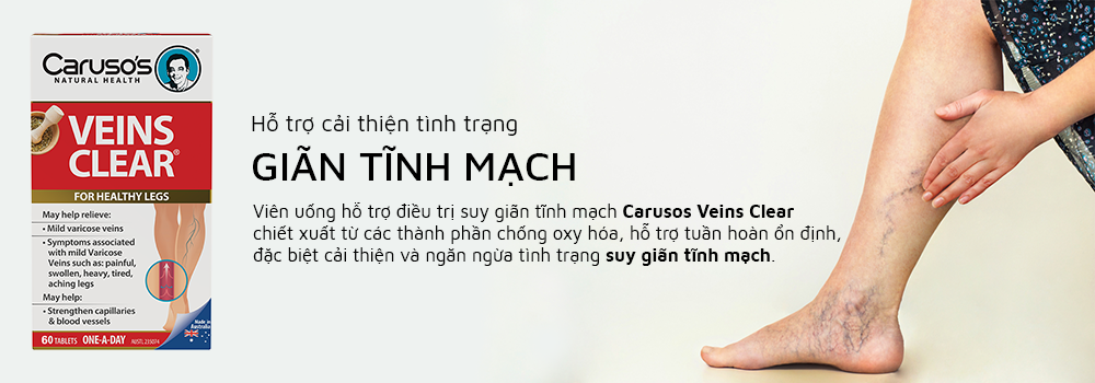 Caruso's Veins Clear là sản phẩm hỗ trợ hiệu quả cho những ai đang gặp phải vấn đề suy giãn tĩnh mạch. Viên uống giảm suy giãn tĩnh mạch này chứa đựng công thức đặc biệt từ Úc, giúp giảm triệu chứng đau nhức, sưng tấy và còn hỗ trợ cải thiện tuần hoàn máu trong cơ thể. Mua Carusos Veins Clear chính hãng giúp bạn yên tâm về chất lượng và hiệu quả sản phẩm.Thành phần Carusos Veins Clear nổi bật với chiết xuất từ hạt dẻ ngựa và vitamin C, giúp cải thiện sức khỏe tĩnh mạch và giảm viêm. Công dụng Carusos Veins Clear không chỉ dừng lại ở việc giảm các triệu chứng suy giãn tĩnh mạch mà còn hỗ trợ tăng cường sức bền của thành mạch máu, giảm nguy cơ tĩnh mạch bị tổn thương.Đối tượng sử dụng chính bao gồm người thường xuyên phải đứng hoặc ngồi lâu, người có triệu chứng suy giãn tĩnh mạch và người muốn phòng ngừa bệnh liên quan đến tĩnh mạch. Giá Carusos Veins Clear hợp lý với chất lượng và công dụng vượt trội mà nó mang lại.Khi sử dụng viên uống Carusos Veins Clear, bạn sẽ cảm nhận được sự cải thiện rõ rệt, không còn cảm giác mệt mỏi hay đau đớn do suy giãn tĩnh mạch gây ra. Việc chọn Carusos Veins Clear Úc là lựa chọn thông minh để chăm sóc sức khỏe tĩnh mạch của bạn một cách toàn diện.