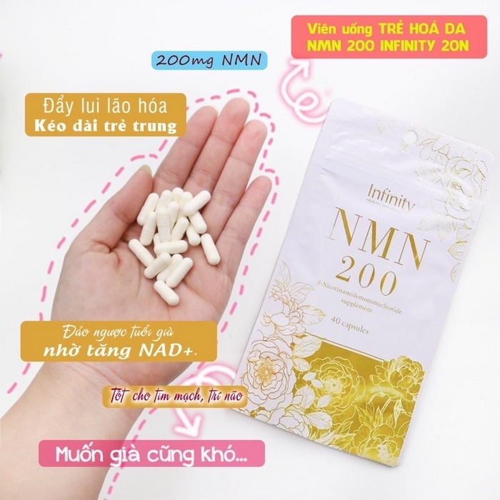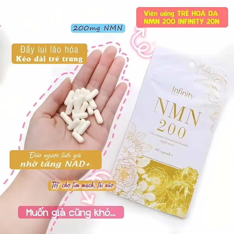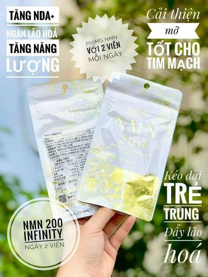 Infinity NMN 200 là một sản phẩm tiên tiến đến từ Nhật Bản, được thiết kế nhằm hỗ trợ chống lão hóa hiệu quả. Với thành phần chính là NMN (Nicotinamide Mononucleotide), viên uống NMN 200 giúp kích thích sản xuất năng lượng tế bào, cải thiện sức khỏe tổng thể và làm chậm quá trình lão hóa. Công dụng NMN 200 không chỉ dừng lại ở việc tăng cường sức khỏe mà còn hỗ trợ dưỡng trắng da, làm mờ nếp nhăn, và tăng độ đàn hồi cho làn da. Sản phẩm thích hợp cho những người trên 30 tuổi, người chịu áp lực công việc cao và phụ nữ sau sinh. Infinity NMN 200 chính hãng Nhật Bản được đóng gói tiện lợi với quy cách 40 viên/túi, dễ dàng mang theo và sử dụng hàng ngày. Thành phần NMN 200 được chiết xuất từ các nguồn nguyên liệu tự nhiên, đảm bảo an toàn và hiệu quả. Khi sử dụng đều đặn, người dùng sẽ cảm nhận được sự cải thiện rõ rệt về làn da và sức khỏe.Để trả lời câu hỏi "NMN 200 giá bao nhiêu" hay "mua NMN 200 ở đâu", bạn nên lựa chọn các nhà phân phối uy tín để đảm bảo chất lượng sản phẩm. Tác dụng Infinity NMN 200 đã được nhiều người tiêu dùng khẳng định qua trải nghiệm thực tế, là lựa chọn lý tưởng cho những ai muốn duy trì sắc xuân dài lâu.