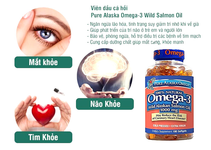Viên dầu cá hồi Pure Alaska Omega là sản phẩm chất lượng cao từ Mỹ, nổi bật với công dụng bổ tim mạch và hỗ trợ sức khỏe toàn diện. Với hàm lượng 1000mg dầu cá hồi trong mỗi viên, sản phẩm giúp bổ sung omega 3 từ cá hồi, một dưỡng chất thiết yếu cho cơ thể. Omega 3 nổi tiếng với khả năng giảm thiểu nguy cơ mắc các bệnh về tim mạch, tăng cường sức khỏe não bộ và thị lực, đồng thời hỗ trợ giảm viêm hiệu quả. Sản phẩm này đặc biệt phù hợp cho ba nhóm đối tượng chínhngười trưởng thành cần bổ sung omega 3 hàng ngày, những người có nguy cơ mắc bệnh tim mạch và người muốn cải thiện sức khỏe não bộ. Thành phần chính của viên dầu cá hồi Alaska là axit béo omega 3 tự nhiên, giúp tối ưu hóa hoạt động của hệ tuần hoàn và não bộ. Đặc biệt, công dụng dầu cá hồi Alaska đã được chứng minh trong việc cải thiện chức năng nhận thức và bảo vệ mắt khỏi thoái hóa.Khi bạn mua dầu cá hồi Pure Alaska, bạn có thể yên tâm về chất lượng sản phẩm chính hãng. Viên uống dầu cá Alaska không chỉ tốt cho sức khỏe mà còn là lựa chọn an toàn, hiệu quả cho việc duy trì một cơ thể khỏe mạnh. Nếu bạn đang thắc mắc Pure Alaska Omega giá bao nhiêu, hãy tham khảo ngay tại các cửa hàng uy tín để có mức giá tốt nhất. Công dụng omega cá hồi từ viên dầu cá hồi này sẽ là giải pháp lý tưởng cho những ai quan tâm đến sức khỏe tim mạch và toàn diện.