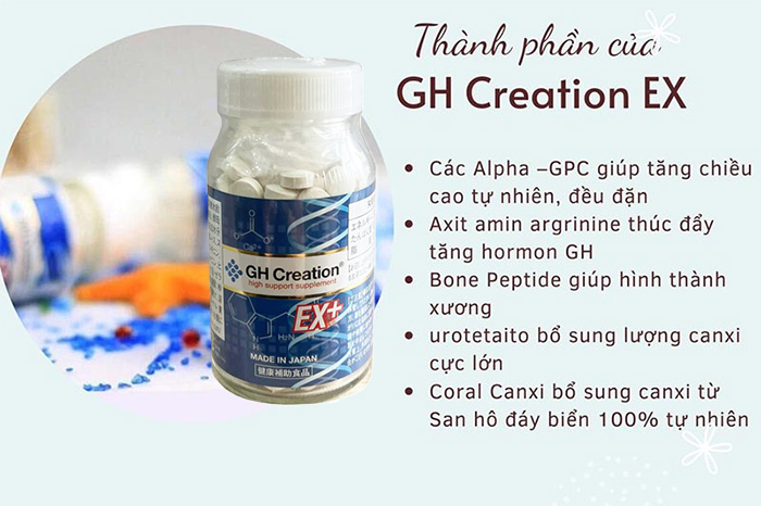 GH Creation EX+ là một loại thực phẩm chức năng chứa thành phần chính là Alpha-GPC, có khả năng kích thích sản xuất hormone tăng trưởng trong cơ thể. Hormone tăng trưởng đóng vai trò quan trọng trong việc phát triển chiều cao, giúp xương và sụn phát triển, tăng cường sức khỏe xương khớp và cải thiện chiều cao tự nhiên.
