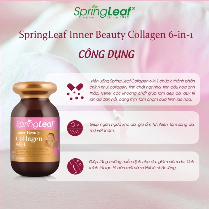 Spring Leaf Collagen 6 in 1 180 viên là sản phẩm bổ sung collagen đến từ Úc. Inner Beauty Collagen Spring Leaf được nhiều người quan tâm khi tìm sản phẩm hỗ trợ chăm sóc da và bổ sung collagen trong chế độ làm đẹp hằng ngày.