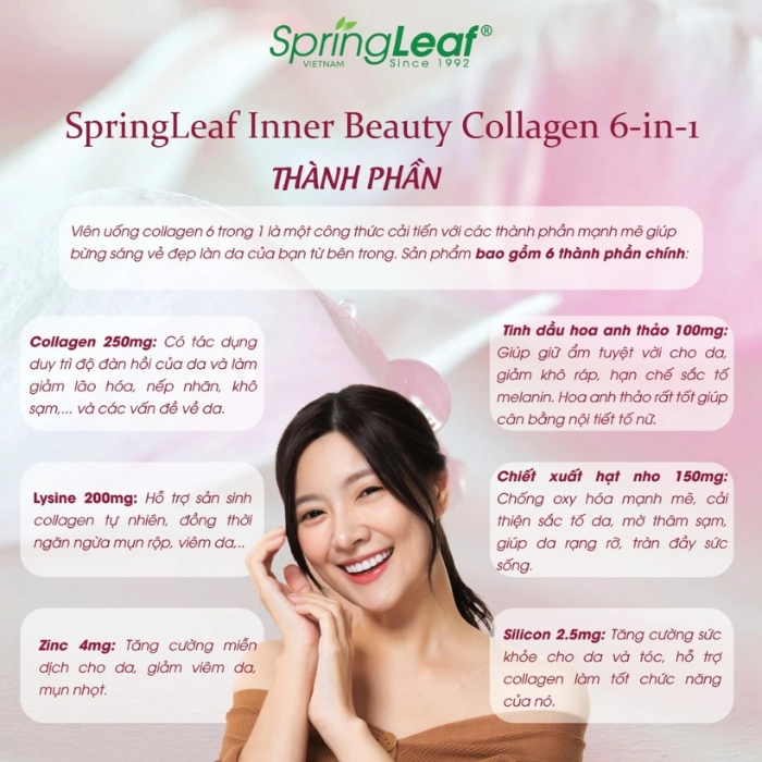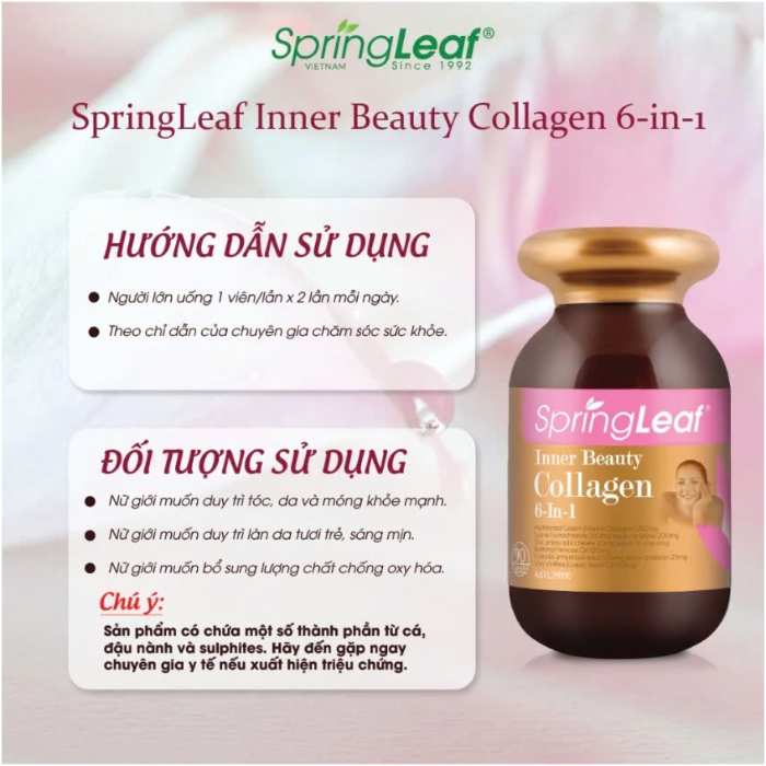 | Tên sản phẩm | Viên uống Inner Beauty Collagen 6 in 1 Spring Leaf Úc – Hộp 180 viên |