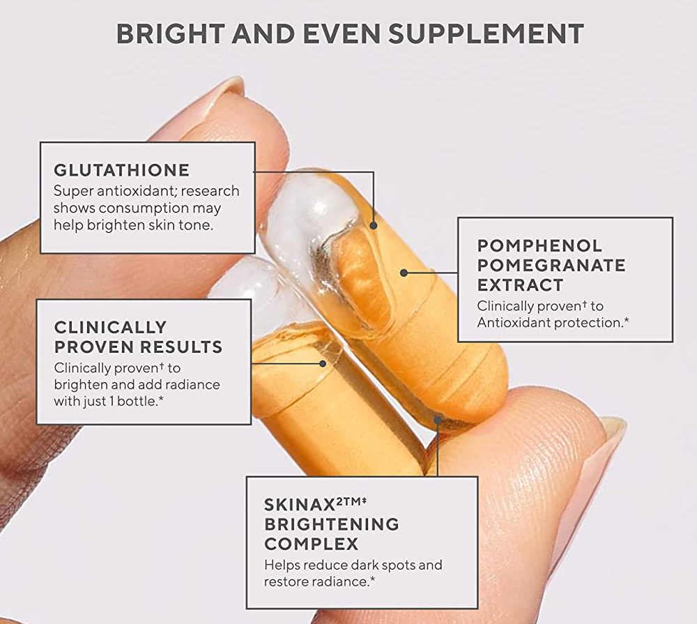 Viên uống chống nắng, trắng da Murad Bright & Even Supplement giúp tăng cường khả năng sản sinh collagen, giúp hạn chế hình thành nếp nhăn
